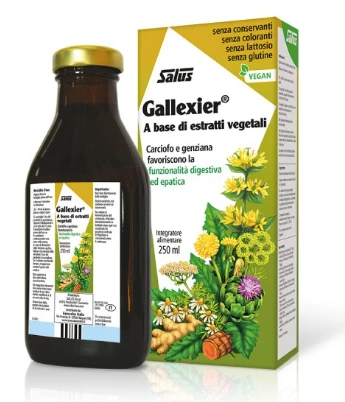 Estratto acquoso (75 %) di: carciofo (Cynara scolymus L.) foglia, tarassaco (Taraxacum officinale Weber) foglia, genziana (Gentiana lutea L.) radice, curcuma (Curcuma longa L.) rizoma, millefoglio (Achillea millefolium L.) parte aerea, zenzero (Zingiber officinale Rosc.) rizoma, camomilla (Matricaria Chamomilla L.) fiore, finocchio (Foeniculum vulgare Mill.) frutto, arancia amara (Citrus aurantiumL. susp. amara) buccia, cardo benedetto (Cnicus benedictus L.) parte aerea, trifoglio fibrino (Menyanthes trifoliata L.) foglia, cardamomo (Elettaria cardamomum [L.] Maton) seme. Sciroppo di fruttosio.