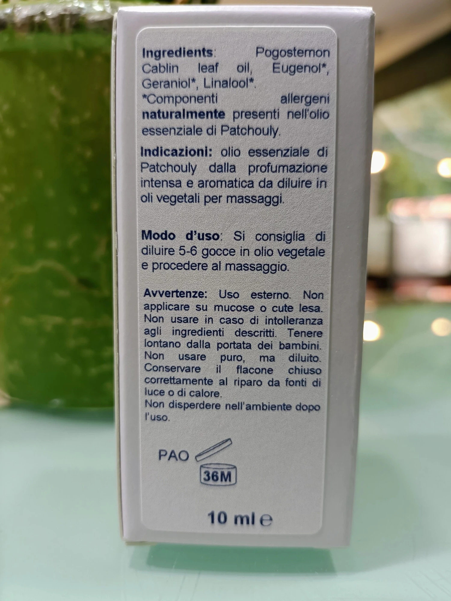Ingredienti: 100% olio essenziale di Patchouly (Pogostemon Cablin leaf oil), Eugenol*, Geraniol*, Linalool*.